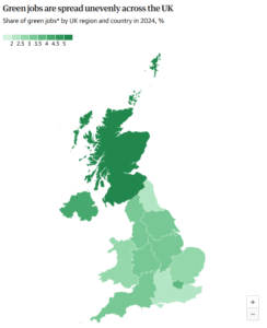 Although green jobs are growing fast, an annual survey of the sector by the auditor PwC found that the boom is not spread equally across Britain’s regions. In Scotland, green jobs make up 5.6% of the new jobs on offer, but in the East Midlands the figure is behind the national average of 3.3% at just 3.1%.